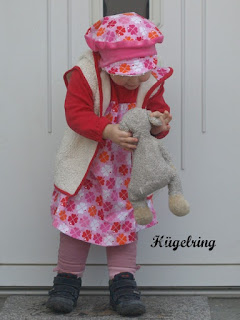 Kleid und Weste habe ich etwas auf Zuwachs in Größe 104 genäht, obwohl mein Kind erst 92 cm groß ist. Sie versinkt trotzdem nicht darin und trägt beide Kleidungsstücke sehr gerne. Auch die Mütze kommt bei der kleinen Maus sehr gut an.